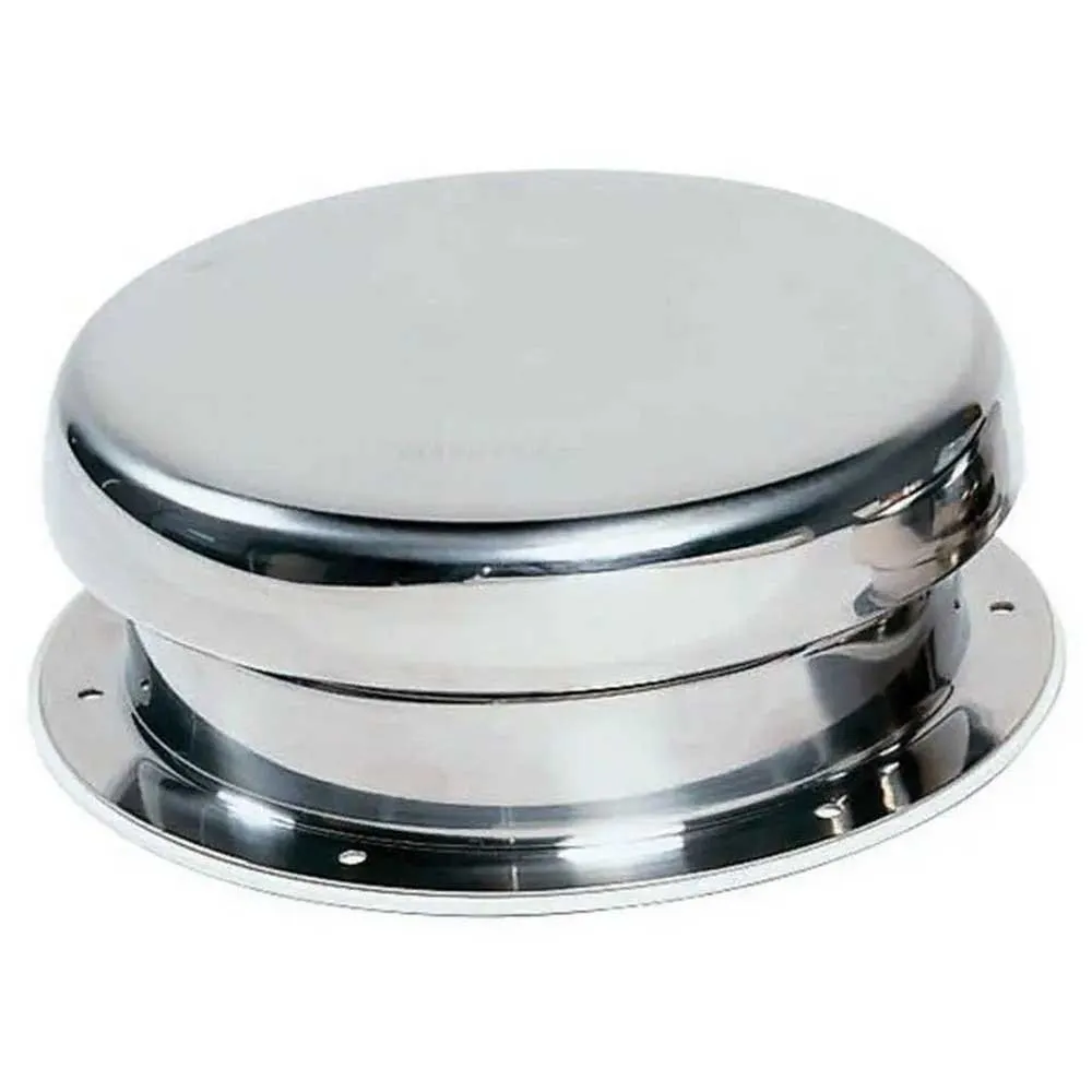 Stainless steel (AISI 316) mushroom ventilator, polished high-gloss, including mosquito screen and synthetic counterflange. Free flow area 76 cm².
