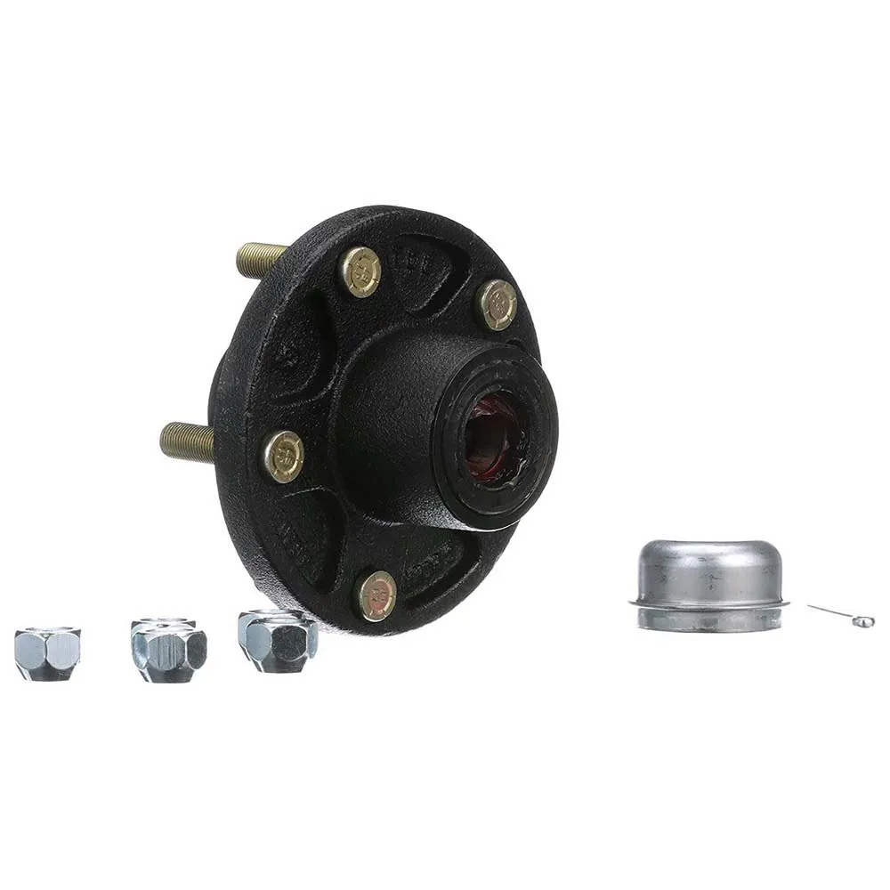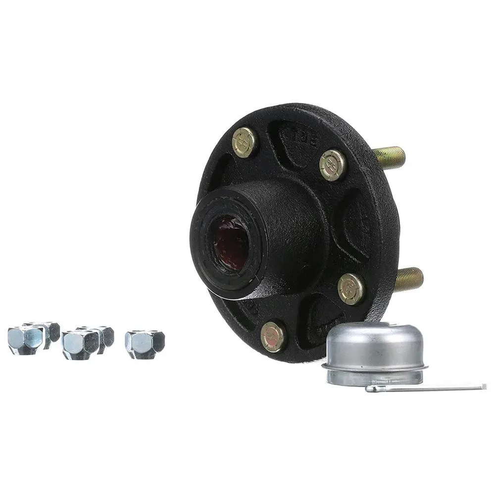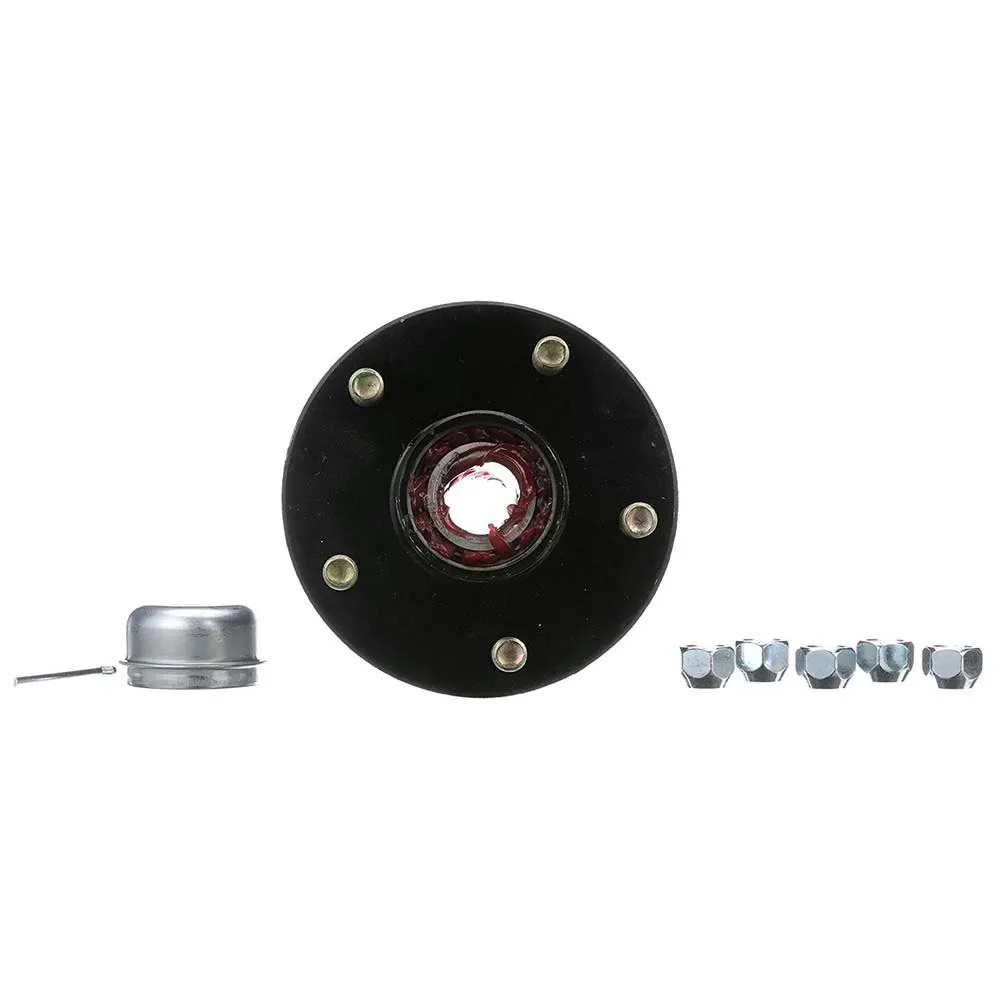 One piece cast hubs complete with pregreased bearings seals dust caps cotter pin and lug nuts.