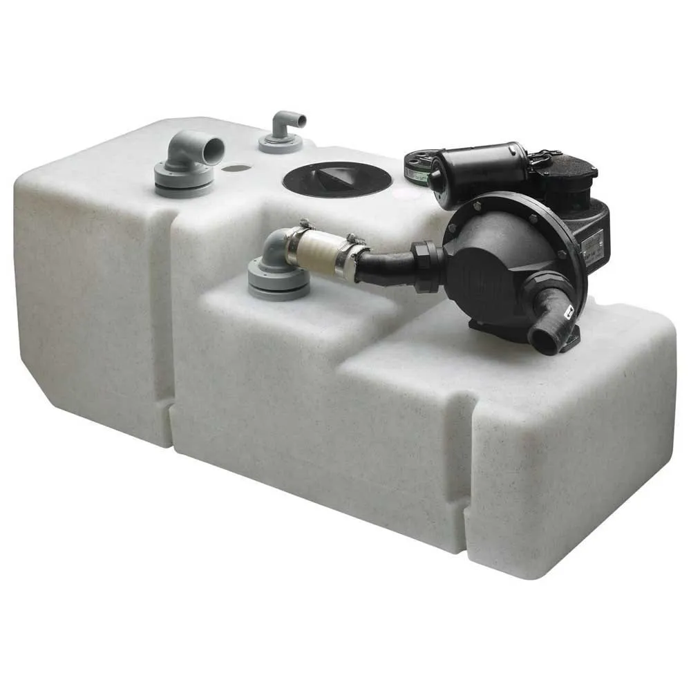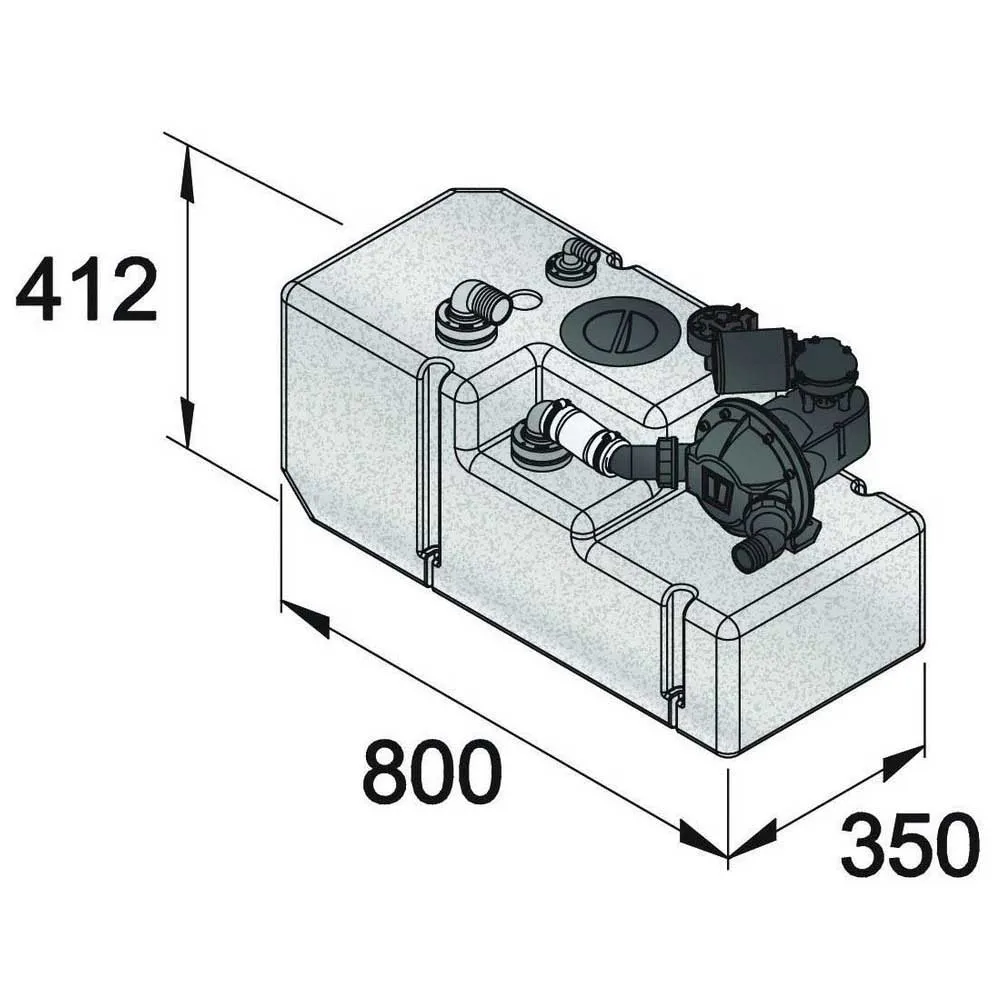 The system comes complete with a VEtus waste water pump type EMP (12 V), an inspection cover, a tank gauge sender (the 12v level gauge must be ordered separately), a plastic suction pipe with ΓΈ 38 mm angled hose connection for discharge from ashore, two securing straps and one ΓΈ 19 mm connection for the breather.